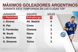 本赛季五大联赛阿根廷射手榜:帕尼切利8球领跑,小蜘蛛6球次席