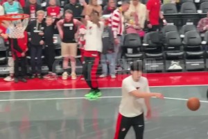 杨瀚森赛前热身完,积极给主力们喂球~可惜今天没什么上场机会!
