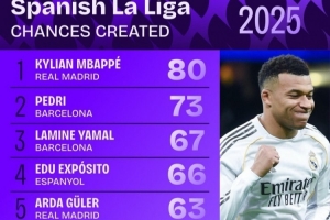 体育资讯12月30日讯 2025年即将结束,数据机构squawka也统计了本年度西甲创造机会情况,姆巴佩力压佩德里居首。