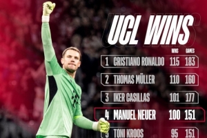 体育资讯9月19日讯 拜仁在昨晚的欧冠焦点战3-1力克切尔西,诺伊尔成为历史第4位欧冠100胜球员。拜仁官方也列出了欧冠历史胜场榜纪录。