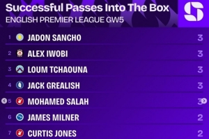 体育资讯9月24日讯 英超第5轮战罢,squawkafootball列各项数据排行,桑乔等5名球员3次成功将球传入禁区,为本轮联赛最多。