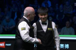 赛后转播给到,希金斯和赵心童握手,赵心童面露笑容。