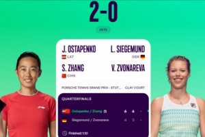 张帅/奥斯塔彭科组合以6-4 6-3轻取西格蒙德/兹沃娜列娃组合,晋级半决赛。