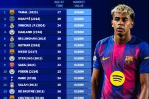 德转历史身价前30:17岁亚马尔2亿 30岁梅西1.8亿 29岁C罗1.2亿