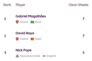 英超前十轮零封榜:拉亚、加布7次霸榜,萨利巴、廷伯、波普5次
