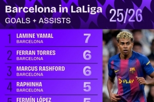 多点开花!本赛季巴萨5名球员联赛参与进球5+,五大联赛首队