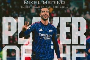 客串中锋梅开二度,阿森纳官方:梅里诺当选本轮欧冠队内最佳球员