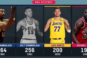 东契奇开赛季5场比赛砍200分 历史第三高&前二都是张伯伦