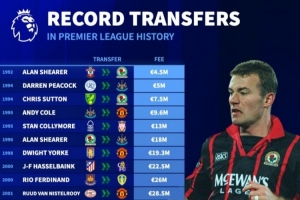 德转英超历史转会费纪录变化:希勒首位标王 伊萨克1.45亿欧最贵