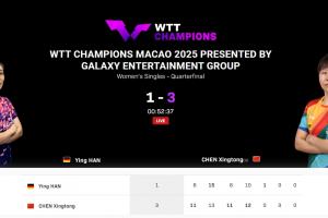 体育资讯09月13日讯 WTT中国澳门冠军赛1/4决赛,削球手韩莹vs陈幸同,第二局触发“数板阶段”。